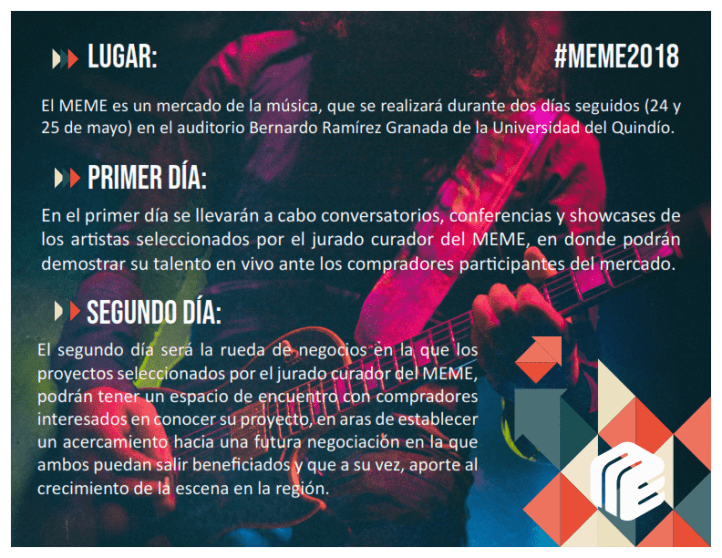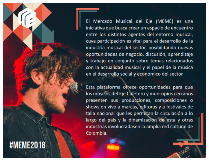 El MEME (Mercado Musical del Eje) extiende hasta el 15 de mayo las inscripciones para los proyectos musicales constituidos (bandas, agrupaciones, solistas, Dj’s, productores) que deseen participar en la rueda de negocios que se realizará los días 24 y 25 de mayo en el Auditorio Bernardo Ramírez Granada de la Universidad del Quindío.